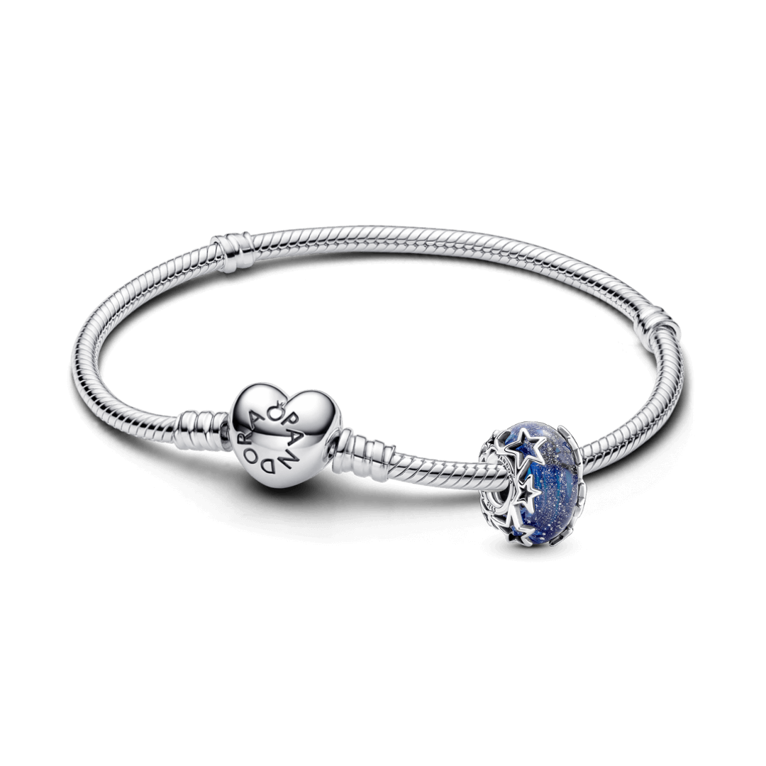 Kết hợp chiếc vòng tay Pandora Moments bạc với khóa trái tim – biểu tượng của tình yêu và sự gắn kết – cùng charm Murano Dải Ngân Hà lấp lánh như vũ trụ thu nhỏ trên tay bạn. Sắc xanh huyền ảo của thủy tinh Murano phản chiếu ánh sáng lung linh, như những vì sao lặng lẽ kể chuyện trong đêm.